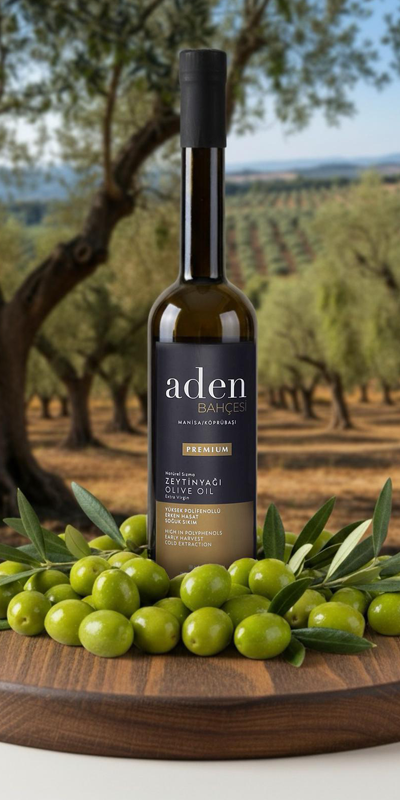 • Aden Bahçesi Premium Naturel Sızma Zeytinyağı, Manisa’nın Köprübaşı ilçesinde yetiştirilen Trilye tipi zeytinlerin erken hasat döneminde özenle elle toplanmasıyla üretilmiştir. Zeytinler, hasattan sonra maksimum 4 saat içinde soğuk sıkım (27°C) yöntemiyle işlenerek <0,2 asit oranına ve +300 mg/kg polifenol değerine ulaşmıştır
